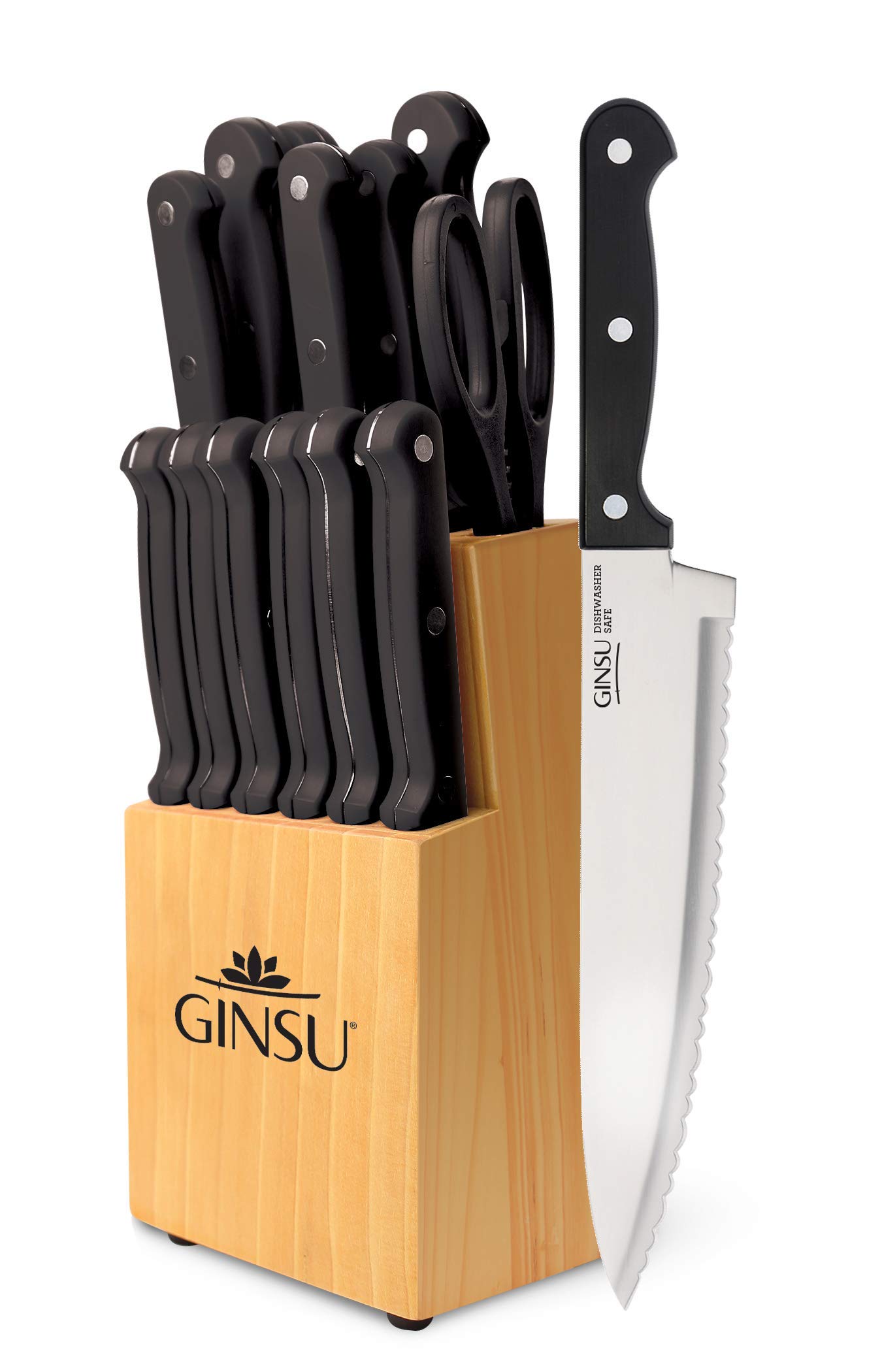 - Say hello to ginus’s Kiso series! The Black 14 piece Kiso knives are the perfect sharp, high-quality, uncomplicated set of tools for any kitchen. Kiss is easy to own with blades that are polished to a mirror finish making them dishwasher safe! Kiss is easy to use. Their exclusive Ginsu serration make chopping, slicing, and dicing effortless! This 14 piece set includes; 8” chef, 8: slicer, 7” Santoku, 5” Boning, 4. 5” utility, 4. 5” steak (6), 3. 5” Paring, premium shears and a natural wood block.